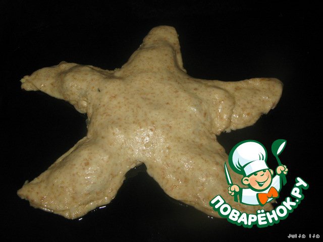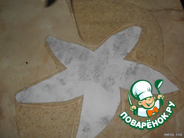 Из бумаги я вырезала шаблон морской звезды. Шаблон кладём на раскатанное тесто, вырезаем по контуру. Можно, конечно, сделать и обычные круглые лепёшки. Просто вырезать большой круг и далее по тексту...