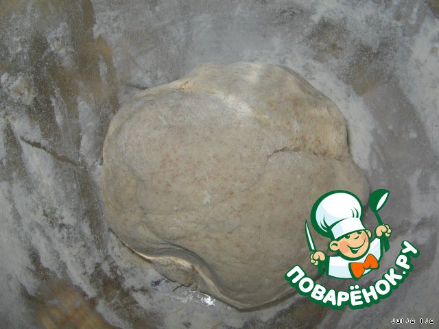 И пшеничную муку. Вымесить тесто. Сначала в миске, потом на столе, подсыпая муки на поверхность. Тесто не должно прилипать к рукам.