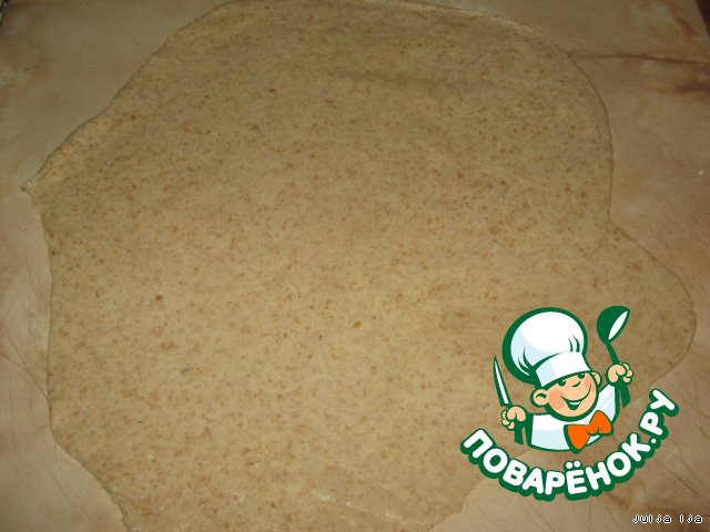 Переносим заготовку на противень, смазанный растительным маслом. Выкладываем начинку.