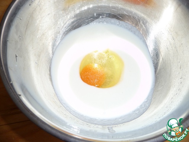 Наливаем кефир в миску, добавляем яйцо, соль, взбиваем.