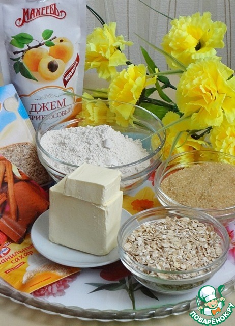 Ингредиенты. Для этого рецепта, помимо прочего, я использовала абрикосовый джем ТМ Махеевъ. Он идеально сочетается с овсяной выпечкой.