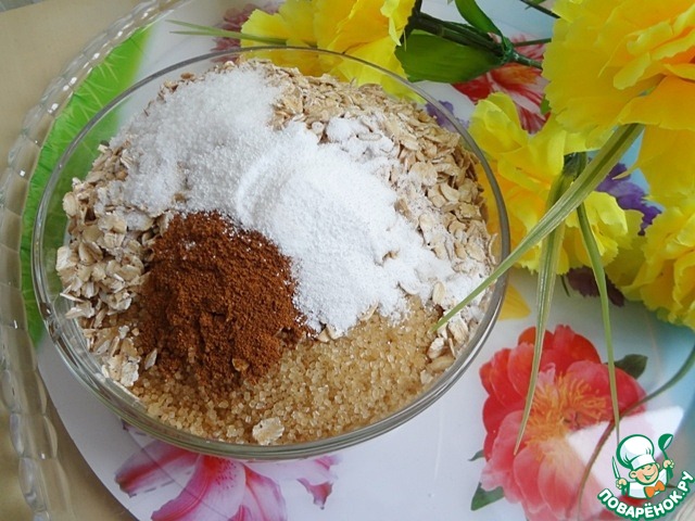 Смешиваем сухие компоненты: овсяные хлопья, муку, коричневый сахар, корицу, соль и разрыхлитель.
