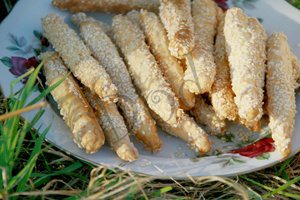 Обвалять палочки в семечках кунжута, выложить на сухой противень. Запекать 15 мин, снять с противня, остудить и подать на стол