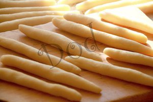 Посыпать стол мукой, скатать из теста палочки размером с карандаш. Яйцо взбить с 1 ч.л. воды, смазать палочки. Духовку нагреть до 180 градусов