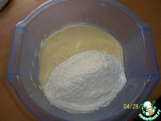 Добавляем муку и перемешиваем. Тесто должно получится консистенции густой сметаны.
