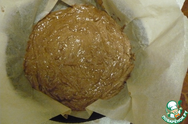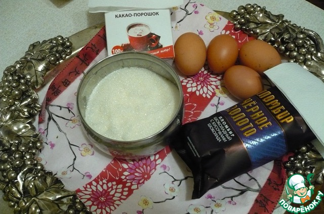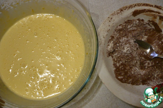 Яйца взбить с сахаром до густого бледного состояния. Просейте муку и какао, перемешайте.