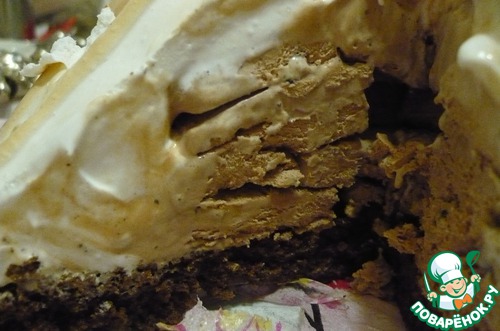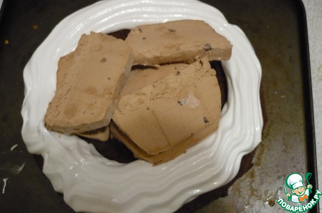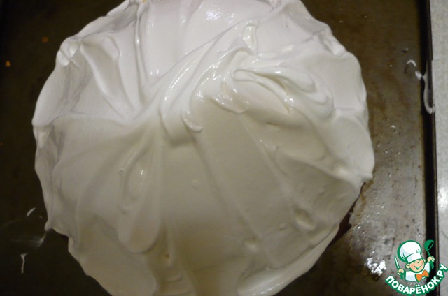 Взбейте яичные белки с сахаром до твердых пиков. Переложить бисквит на кондитерский лист. Подравнять края. Выложить мороженое горкой.