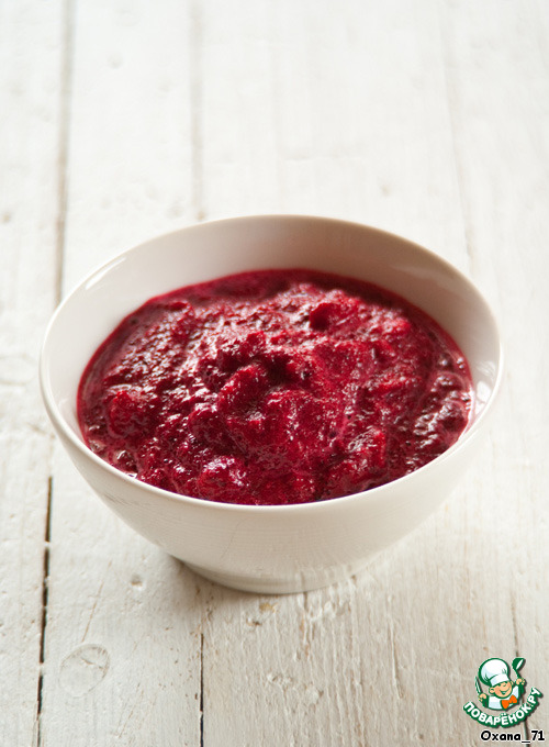 Затем почистить и нарезать кубиками. Очистить одно яблоко и пюрировать вместе с кубиками свеклы в блендере. Если масса немного сухая, то добавить ложку яблочного сока (или свекольного). Выложить пюре в миску, посолить и добавить ложку оливкового масла.
