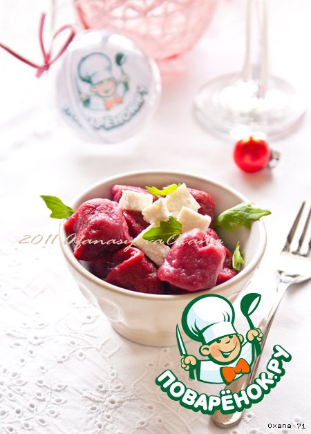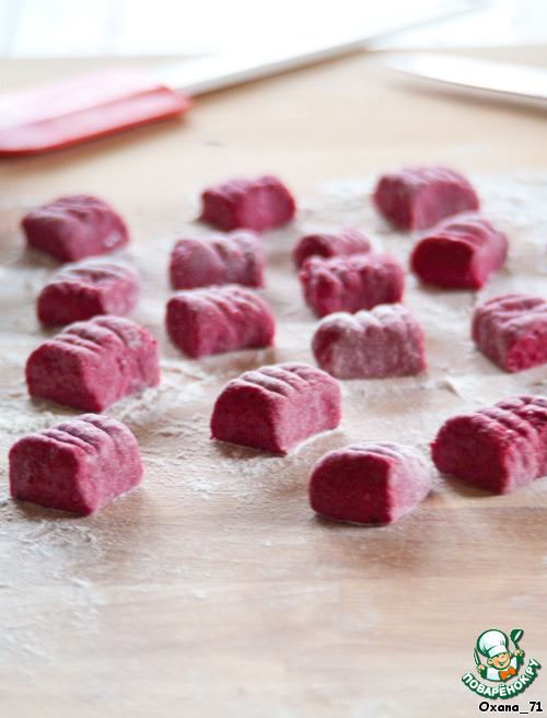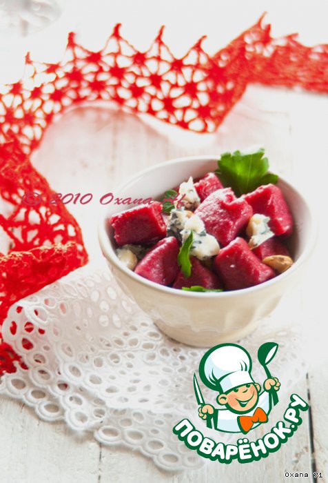 Нарезать кубиками сыр с плесенью (Горгонцолла), выложить его поверх ньeкков и украсить листиками петрушки. Рассчитано на 4 средние порции