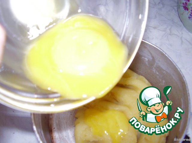 теперь добавляем по одному желтки и вымешиваем деревянной лопаткой