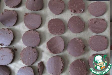 "Колбаску" из теста нарезаем кружками, толщиной 0,5-0,7 см, раскладываем на противень, застеленный пекарской бумагой с зазорами в 1,5-2 см.