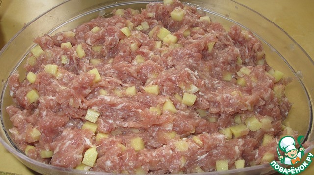 Если фарш "туговат" или "густоват" (как это правильно написать...), добавить немного водички. Добавить картофель к фаршу и перемешать. Начинка готова.