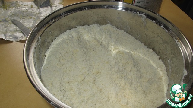 Муку перетереть с маргарином, добавить молочно-дрожжевую смесь и замесить тесто. По ходу замеса если тесто жидковато добавить еще муки. Смотрите по консистенции, готовое тесто не должно липнуть к рукам.