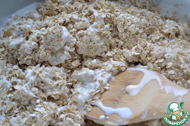 Залить овсяные хлопья кефиром, хорошо перемешать и оставить на 35-40 мин.