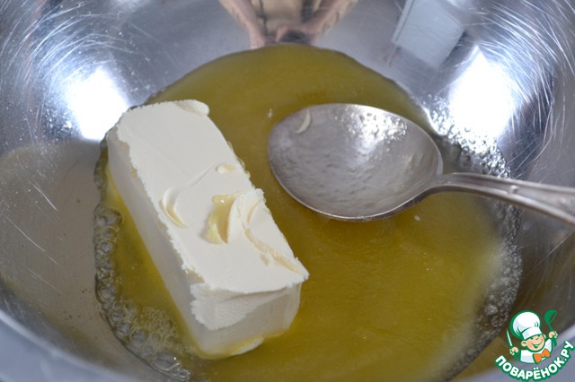 Растопить на маленьком огне маргарин и мед. Чуть-чуть остудить.