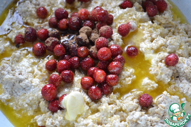 В хлопья с кефиром добавить клубнику, корицу, ванилин (я этот раз делала без него) и вылить маргарин с медом. Хорошо перемешать.