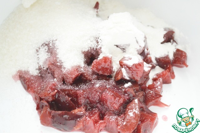 2. Сливу нарезать небольшими кусочками. В сотейнике смешать сливу, сахар, крахмал и воду. Довести до кипения и готовить на медленном огне, помешивая 5 минут. Остудить.