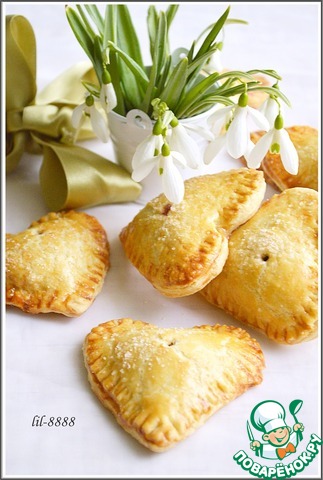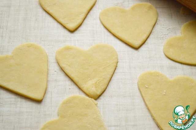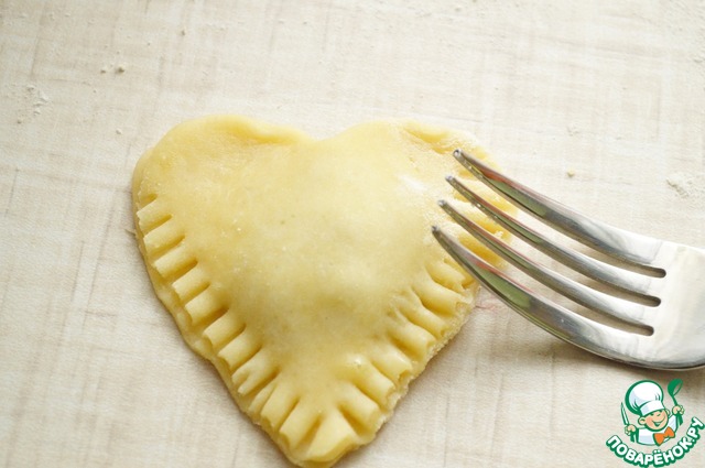 5. Края смазать яйцом, накрыть вторым сердечком и защипнуть хорошо края. Удобно это делать вилкой.