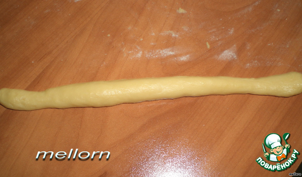 Небольшие кусочки теста раскатать в жгут толщиной с палец и длиной примерно 15 см.