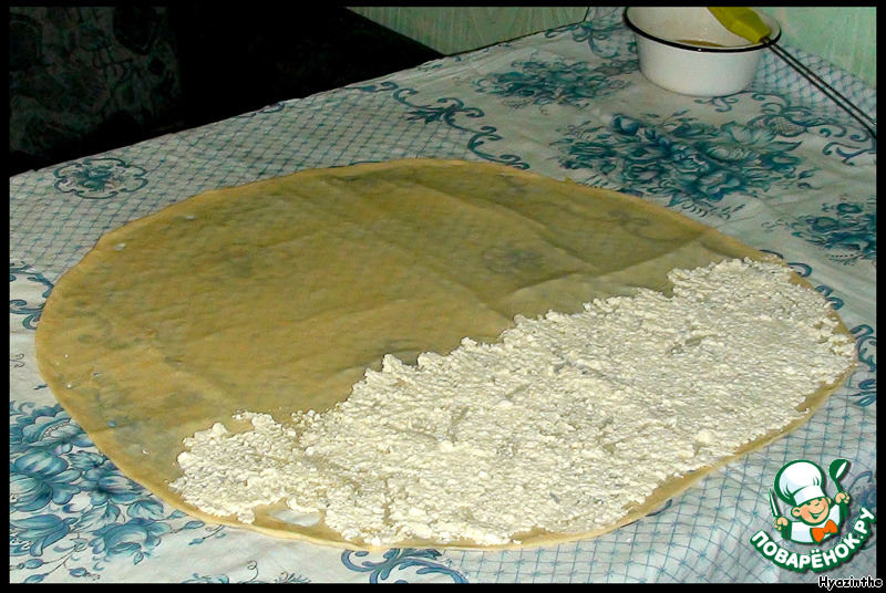 Затем с одного края (от себя) намазываем творог тонким слоем, примерно на 1\\\\\\\\3 или 1\\\\\\\\4 часть коржа.