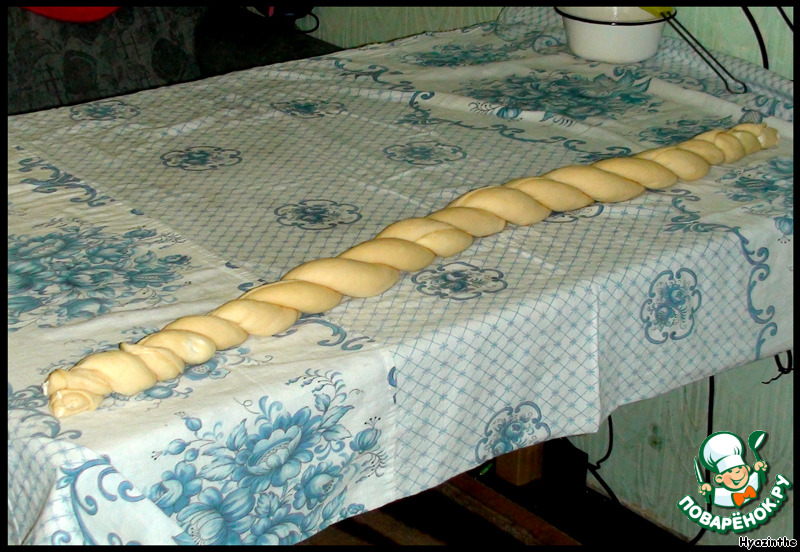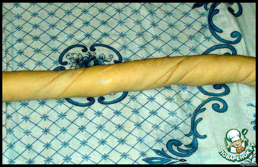 Получившуюся "колбаску" мы перекручиваем, начиная от середины к краям, в разные стороны, но не сильно. И откладываем пока в сторону ее.