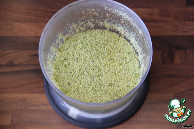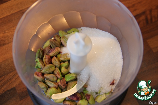 Фисташки очистить и измельчить их в блендере или в кофемолке вместе с сахаром. (Как измельчать орехи, чтобы из них не вышло масло, научила Лариса(Ларек), спасибо ей)