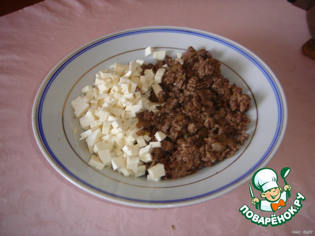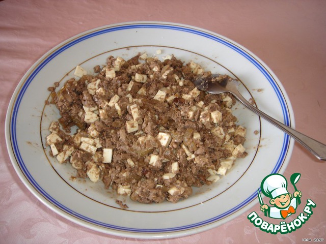 Лук порезать полукольцами и обжарить с куриной печенью. Печень не солить, т.к. будет добавлена брынза.