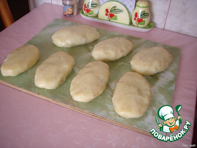 Сформировать лепёшки из картофельного теста. Положить на них 1 чайную ложку начинки, сверху опять лепешку.Залепить в форме котлетки.