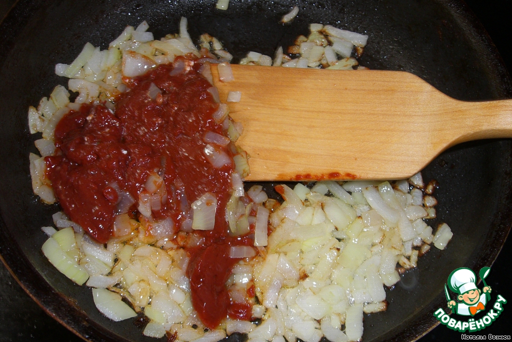 Лук режем мелко, обжариваем его на растительном масле с добавлением томатной пасты.