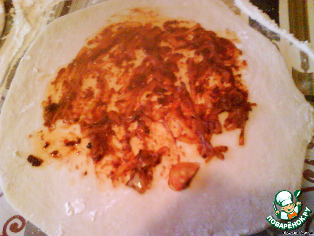 Раскатываем лепешки не очень тонко, примерно около 1 см толщиной, и намазываем луково-томатной смесью