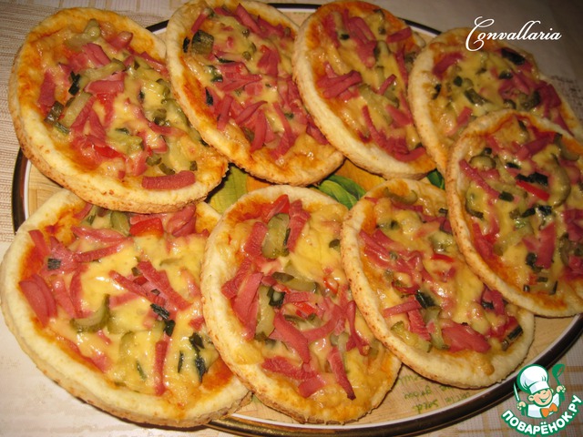 Тесто раскатать толщиной в 3 мм. Вырезать кружки в диаметре примерно 10 см. Выложить на противень, застеленный пергаментом. Каждую лепешку смазать томатным соусом. Сверху распределить начинку, слегка придавливая в тесто. Выпекать в разогретой до 180 гр. духовке примерно 15 минут.