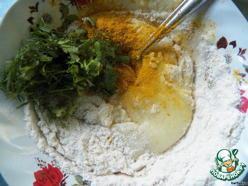 Вмешать в рисовое пюре чеснок, зелень, соль, куркуму, растительное масло, смесь из просеянных рисовой и пшеничной муки. Муку можно взять и обычную, какая у вас есть в наличии. Но в любом случае, смотрите по консистенции вашего теста, чтобы не липло к рукам, возможно, муки понадобится больше или меньше.