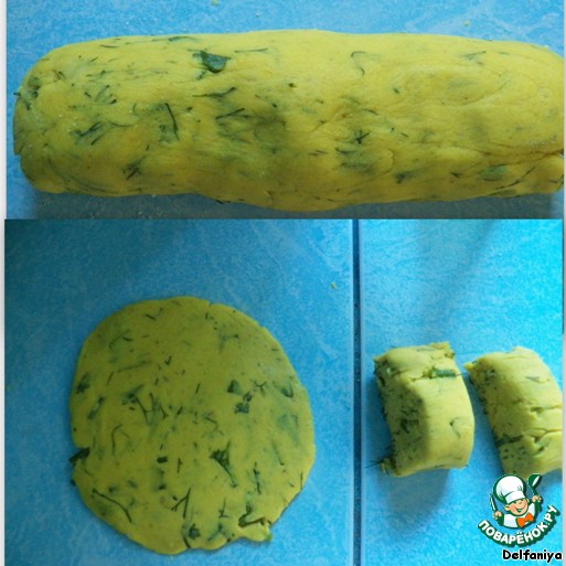 Получается вот такое тесто, которое нужно скатать в колбаску, поделить на 6-7 кусочков и раскатать в небольшие лепешки.