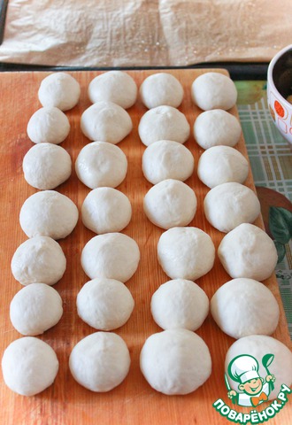 Подошедшее тесто делим на шарики величиной как грецкий орех, у меня получилось 28 шт.