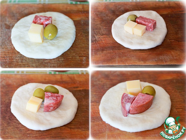 В кусочки теста заворачиваем начинку. Кладём оливку, сыр и кусочки колбасы, комбинируем в произвольном порядке.