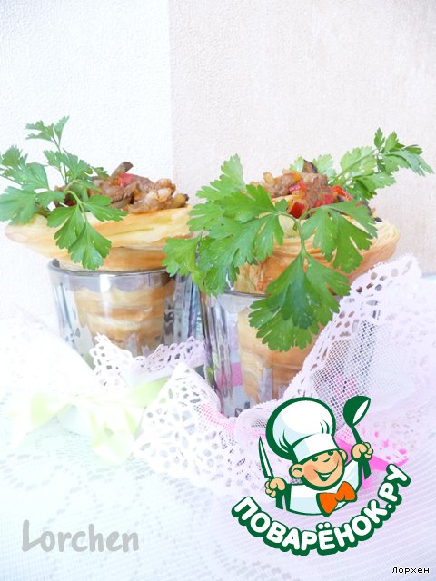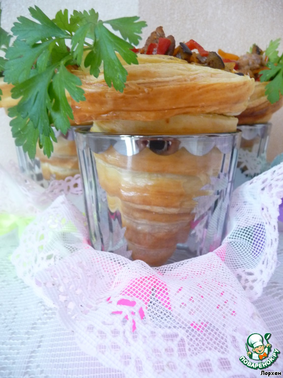 | Мы привыкли, такая трубочка должна быть обязательно с кремом, а я подумала: "А почему б не сделать еe с овоще-мясной начинкой?!" И не пожалела! Очень вкусно!!! |