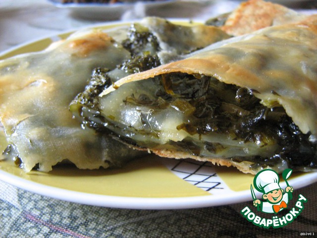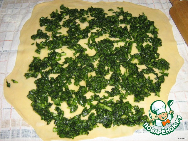 А вот этот - король всех струделей. Именно он и был в оригинальном рецепте! Струдель со щавелем. Я в этот раз слишком много начинки положила, вообще-то начинку нужно укладывать оочень тоненьким слоем, чтобы сочная начинка не возобладала на тестом.