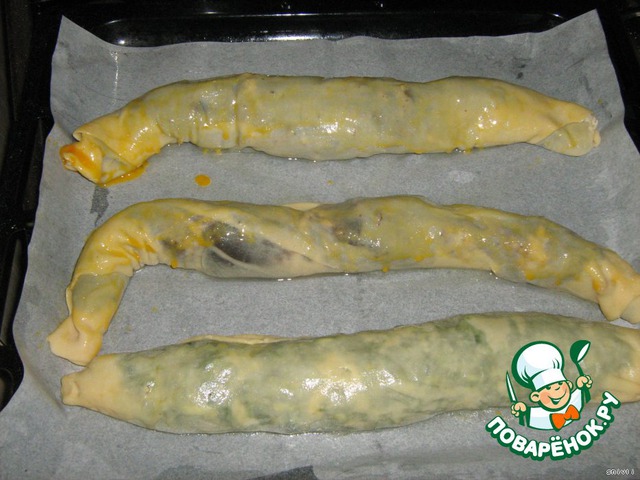 Каждый сворачиваем рулетом, перекладываем на противень , уложенный пекарской бумагой, смазанной маслом или маргарином. Каждый струдель смазываем яйцом - и в духовку. Огонь не очень сильный , может где-то 180 градусов. Я не знаю, у меня цифры, я выпекала на восьмерке.