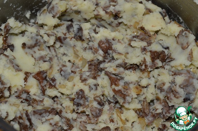 Картофель отварить до готовности, сделать пюре добавить в него ст. л. сливочного масла. Соединить картофельное пюре и мясо с грибами все тщательно перемешать.