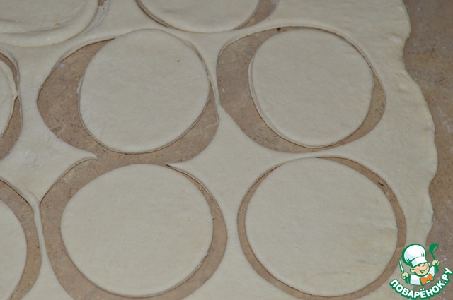Тесто разморозить. Раскатать в пласт и вырезать формочкой четное количество кругов.