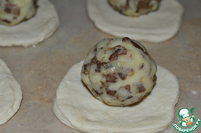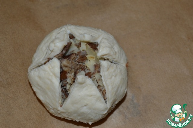 Соединить по два круга вместе, в середину выложить начинку в виде шарика.