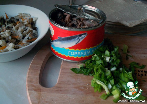 Из горбуши удалить косточки, размять вилкой. Зеленый лук нарезать, добавить вместе с рыбой к начинке.