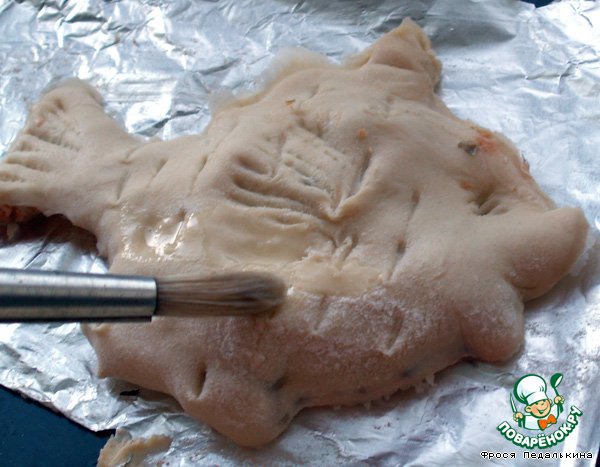 Желток смешать с молоком. Рыбки выложить на смазанный противень, смазать яичной смесью, сделать надсечки плавников и чешуи.