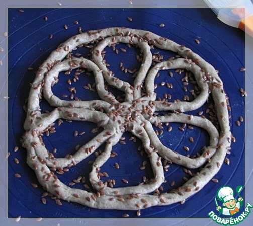 Теперь эту красоту нужно украсить льняным семенем. Я смазала печенье водой и посыпала семенами. Получилось не очень удачно. Следующие жгутики я накручивала уже на россыпи семян.