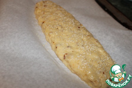 Замесить тесто, скатать тесто в виде батона, положить на смазанный маслом противень или застеленный бумагой. Слегка прижать сверху и запекать 20 минут. Выпекать в духовке, разогретой до 180 градусов.