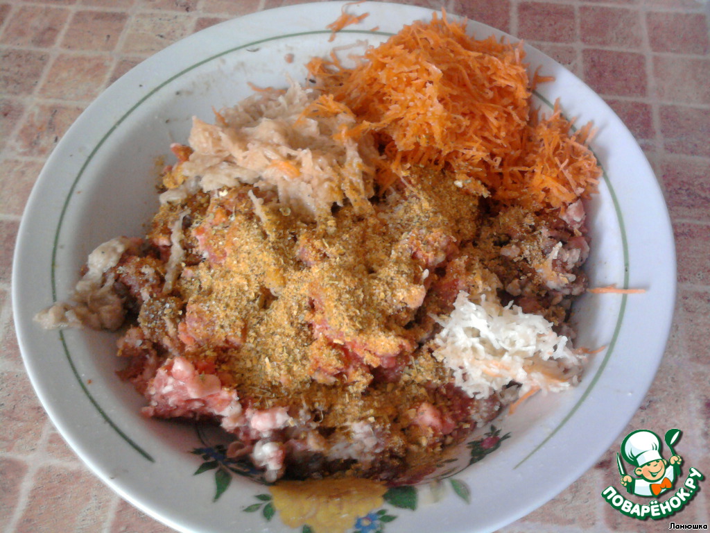 Как обычно, сначала приготовим фарш. Для этого в уже готовый свино-говяжий фарш добавим приправы, натертые на мелкой терке сырую морковочку и картофелину, чеснок. Перемешаем, при необходимости досолим.