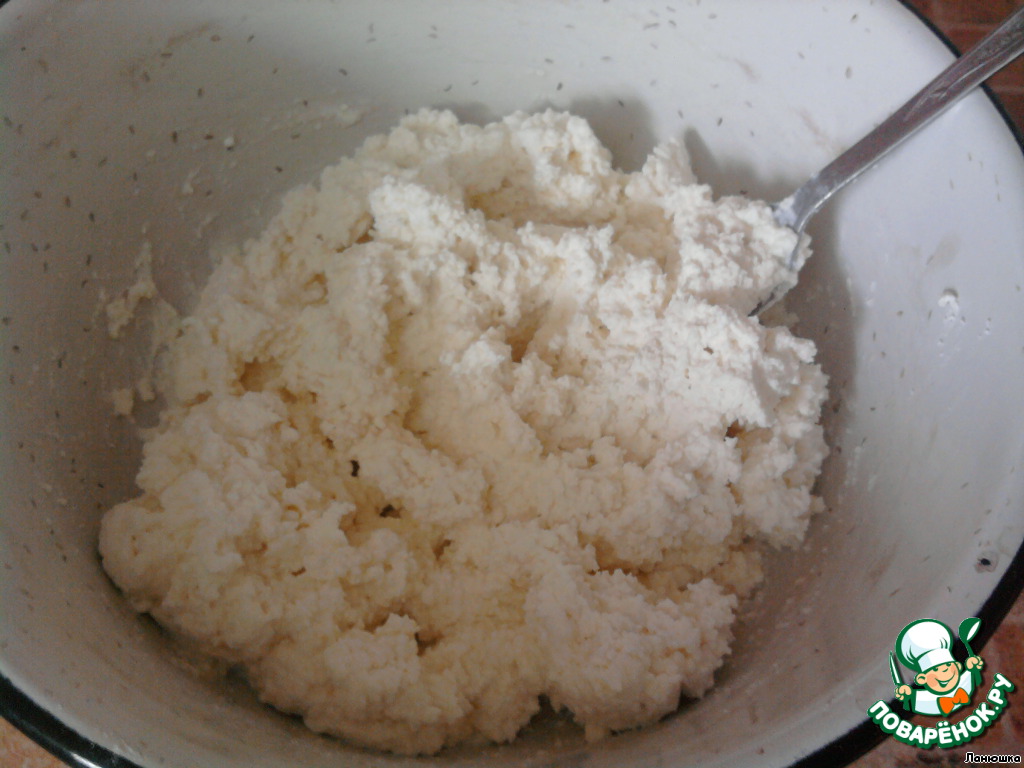 Для теста вилкой разомнем творог. Добавим яйцо, соль и сахар по вкусу, гашеную соду. Тщательно перемешаем. Теперь можно добавить муку.