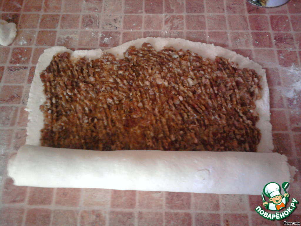 Теперь тесто с фаршем начинаем скручивать в рулет.