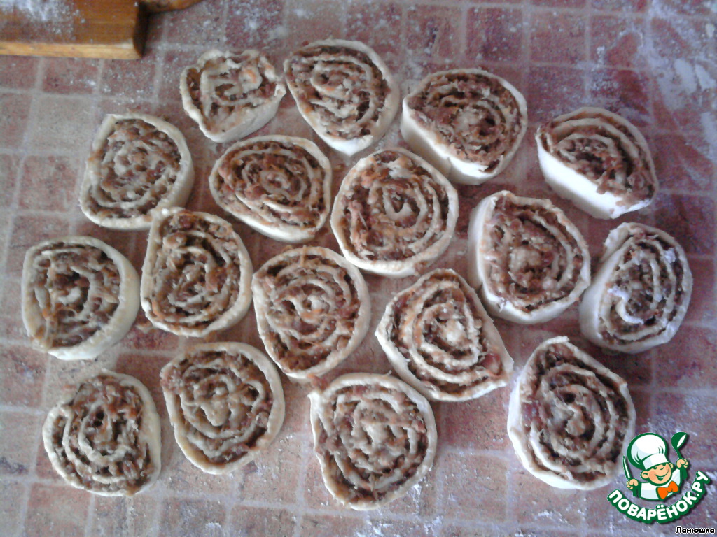 Берем тонкий острый нож и аккуратно нарезаем наш рулет на "улитки" толщиной примерно 1 см. То же самое проделываем с оставшимися тестом и фаршем.
