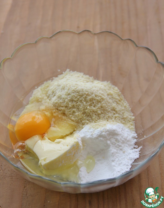 Сливочное масло размягчить до комнатной температуры. Смешать с яйцом, сахарной пудрой, молотым миндалем. Не взбивать, хорошо перемешалось и ладно.
